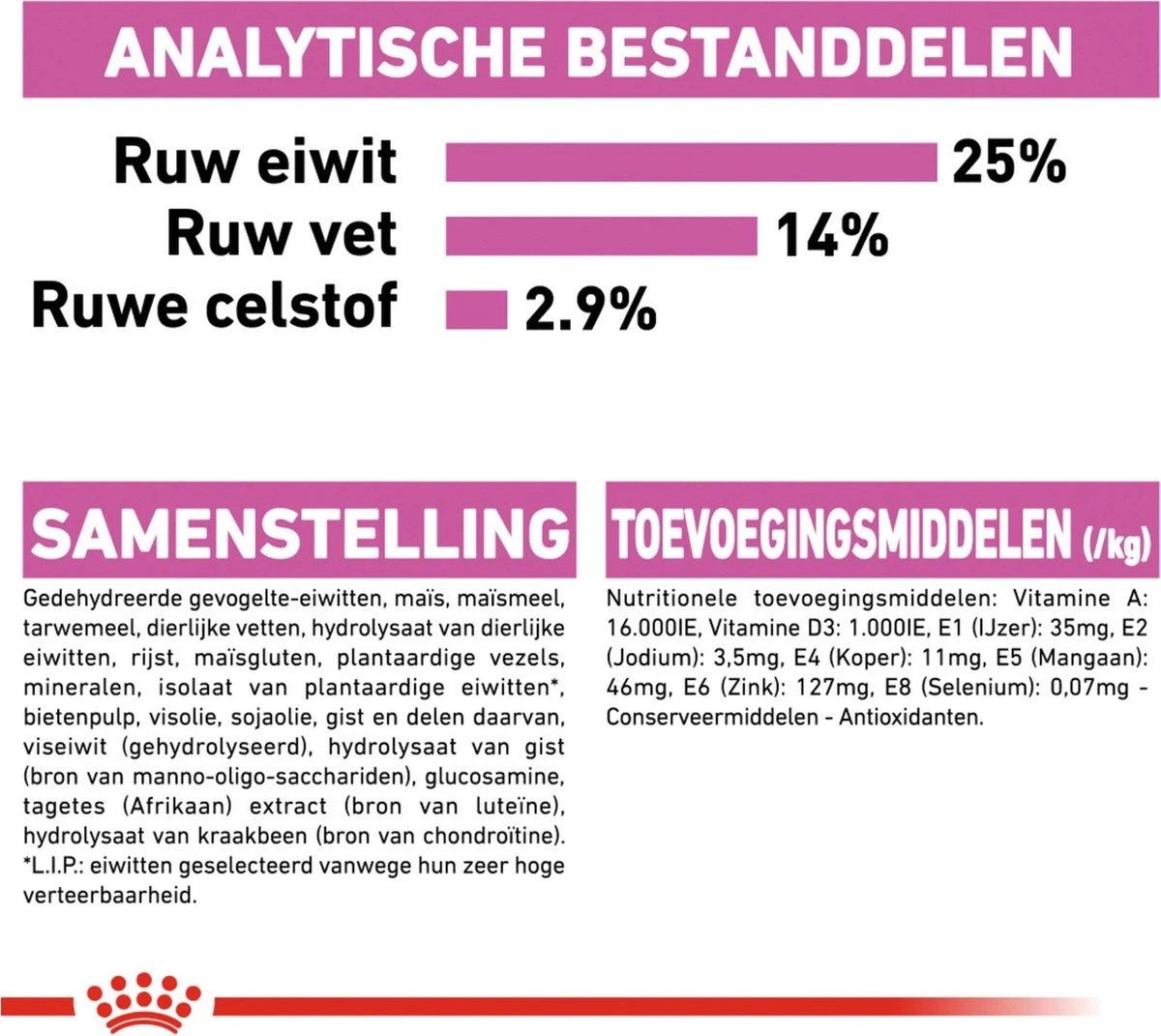 | Analytische bestandsdelen | ANALYTISCHE BESTANDDELEN: Ruw eiwit: 25,0% – Ruw vet: 14,0% – Ruwe as: 6,3% – Ruwe celstof: 3,3%. |